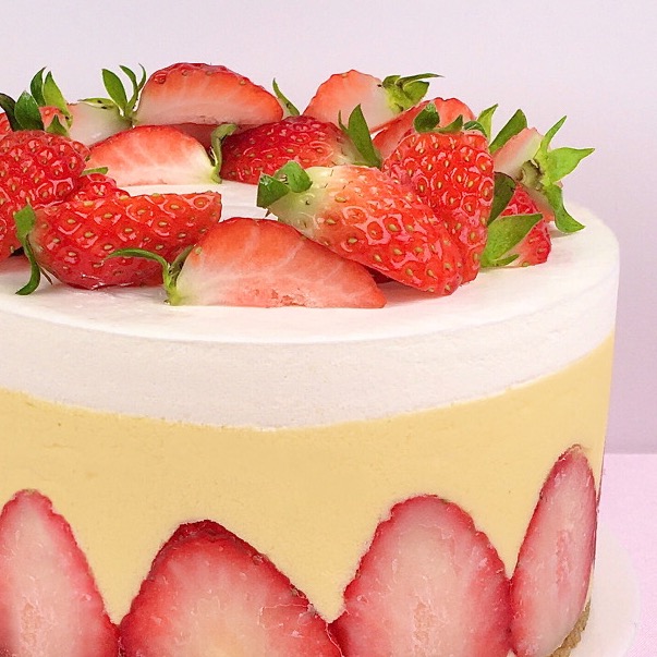 โง Put 7. on a plate and decorate the top with strawberries cut into quarters.